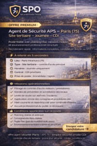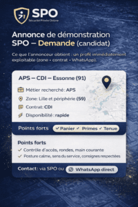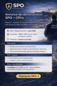SPO diffuse des offres d’emploi, des demandes et des profils (APS, SSIAP, sûreté, événementiel). Publication gratuite + modération. Contact direct (sans intermédiation).