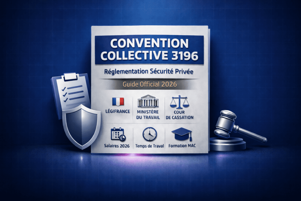 Convention collective 3196 (IDCC 1351) — sécurité privée : si vous travaillez (ou recrutez) dans la branche entreprises de prévention et de sécurité (agent APS, SSIAP, mobile, sûreté, encadrement), ce texte est le référentiel conventionnel pour les salaires minima, la classification, les primes, l’organisation en vacations, les plannings et la formation. Mise à jour Janvier 2026 : ce guide consolide les points qui comptent en pratique (application des minima 2024–2026, preuves attendues, contrôles paie/planning, financement MAC) et une sélection de jurisprudence utile pour comprendre les zones de litige récurrentes (pause réelle, temps de travail effectif, traçabilité des plannings).